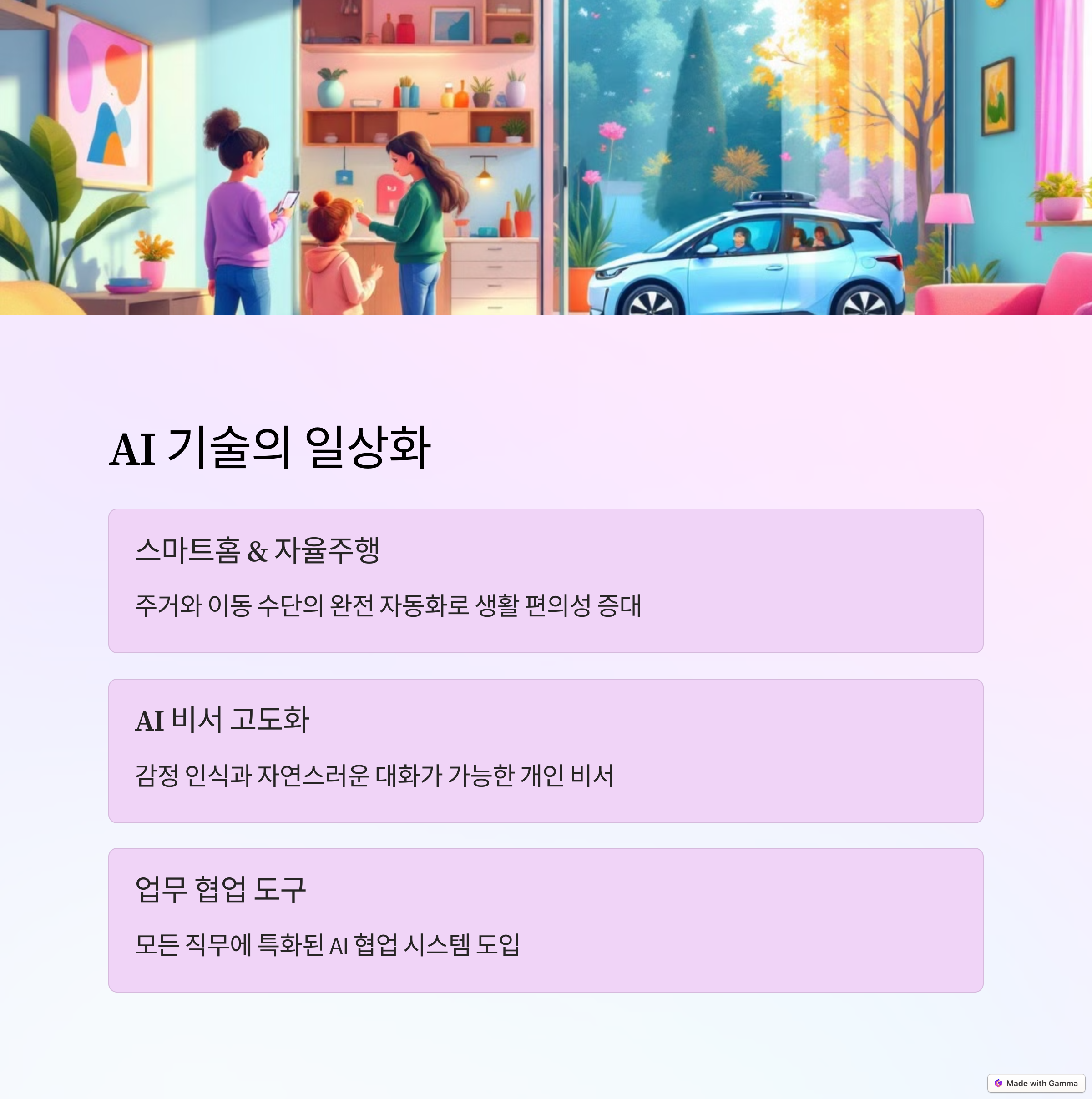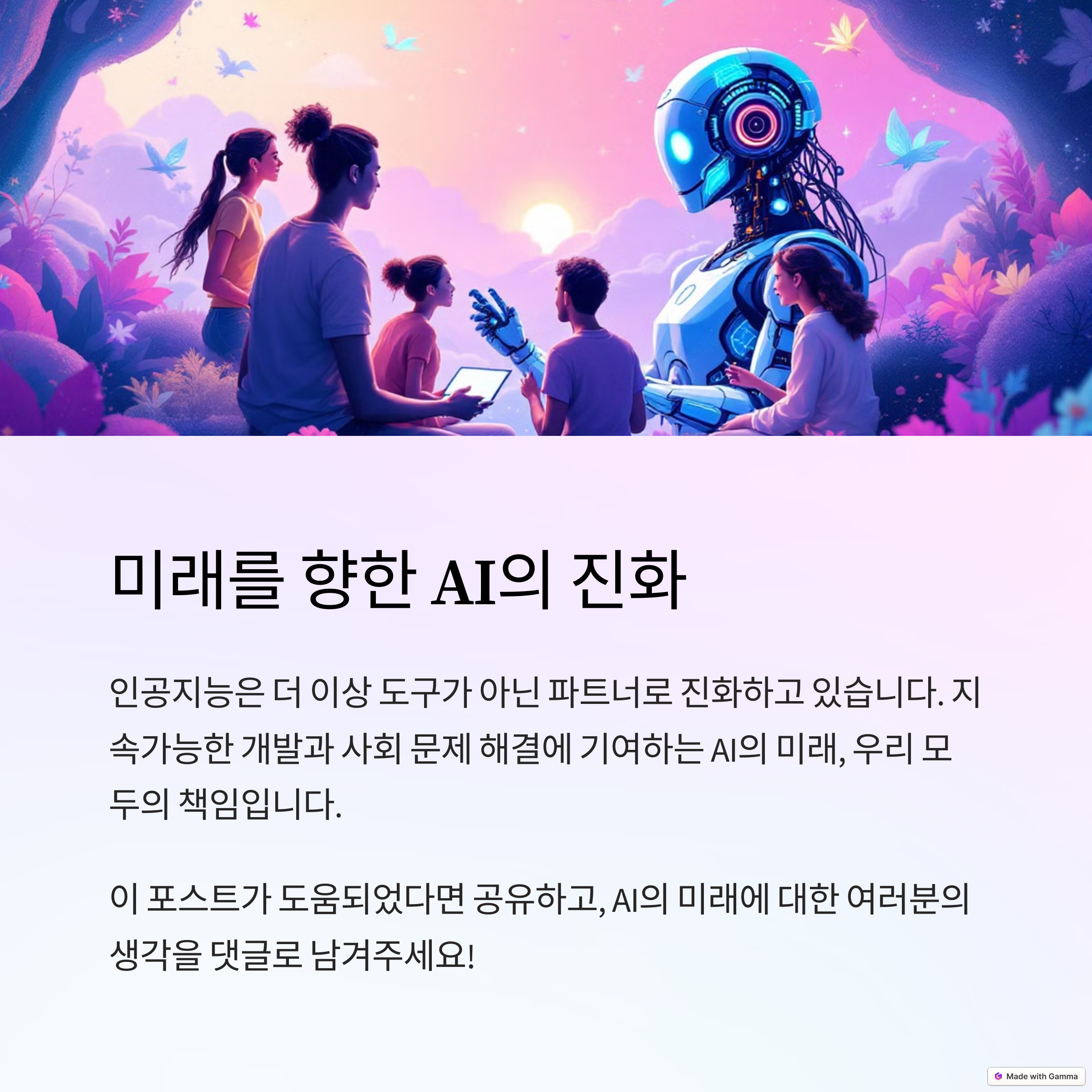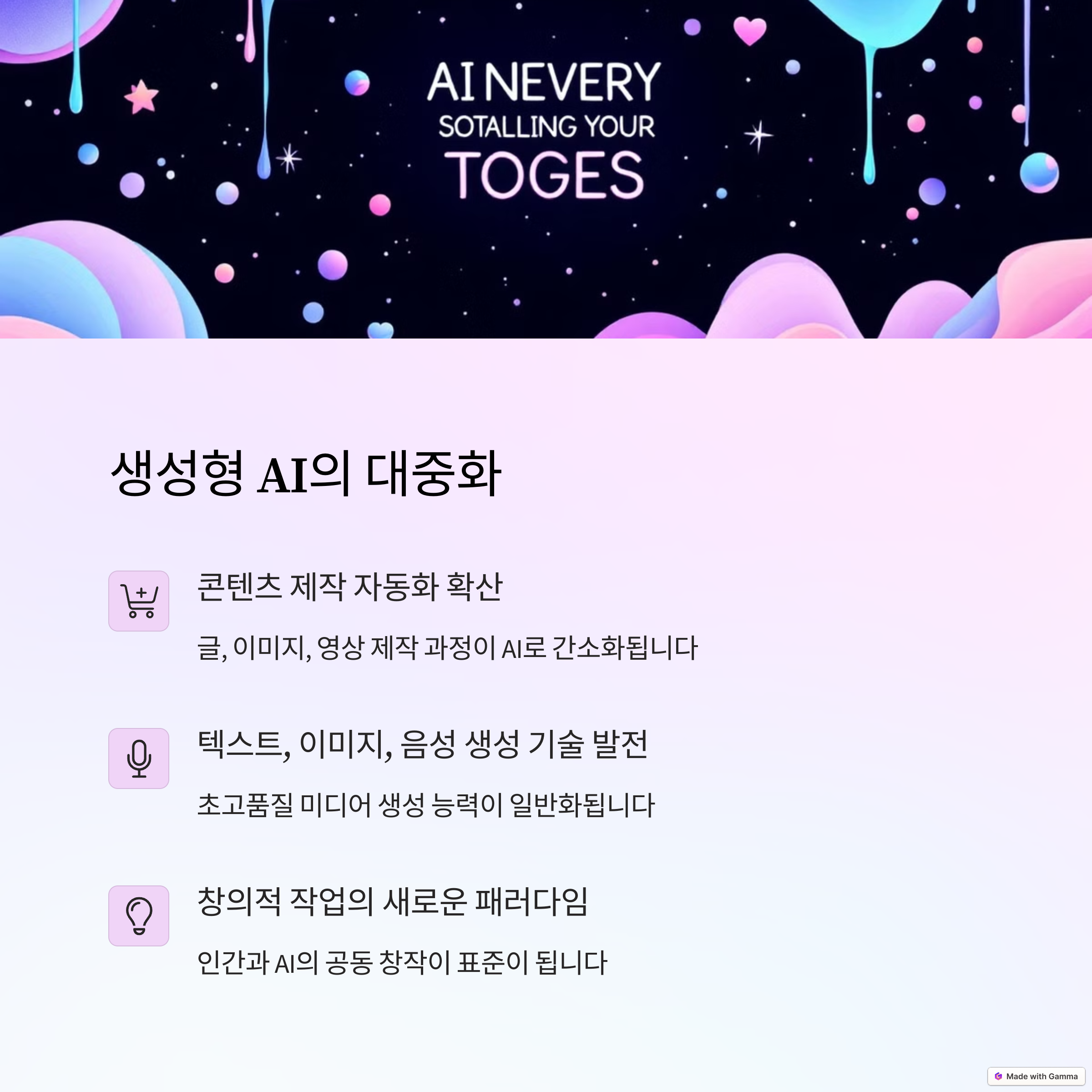 앞으로의 AI는 단순한 기술이 아닌, 문화와 가치관을 반영하는 도구가 될 것입니다. 사용자의 행동과 취향을 분석하여 맞춤형 콘텐츠를 제공하고, 창작자의 상상력을 기술적으로 뒷받침해주는 존재로 성장할 것입니다. 이처럼 2025년의 AI는 인간의 한계를 보완하고, 창의력을 확장하는 데 중점을 둘 것이며, 사회 전반에 걸쳐 긍정적인 영향력을 발휘하게 될 것입니다.