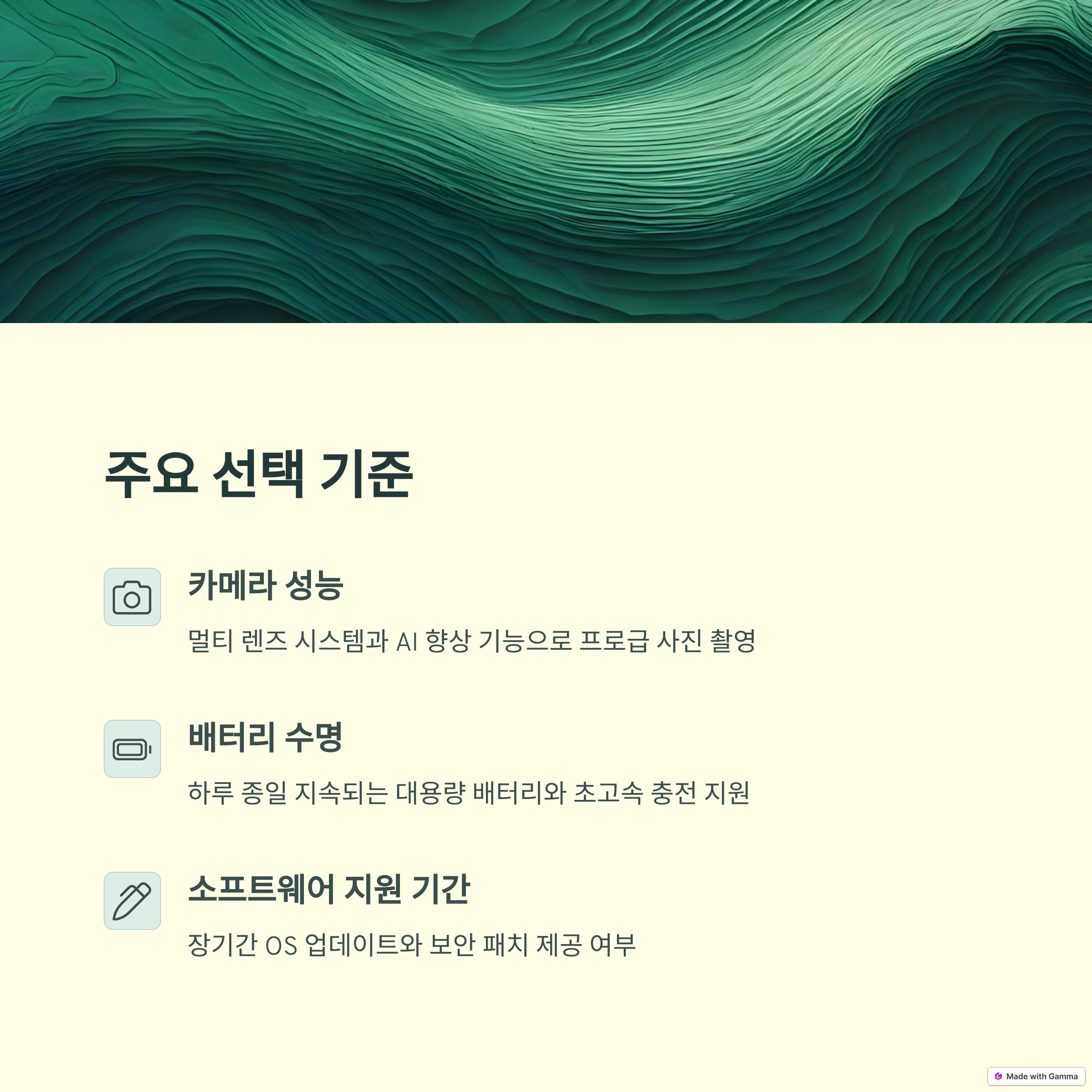 고해상도, 야간 촬영, AI 보정 기능 탑재 여부 | 대용량 배터리, 고속 충전 지원 여부 체크 | 보안 업데이트 주기, OS 지원 연도 확인 |
