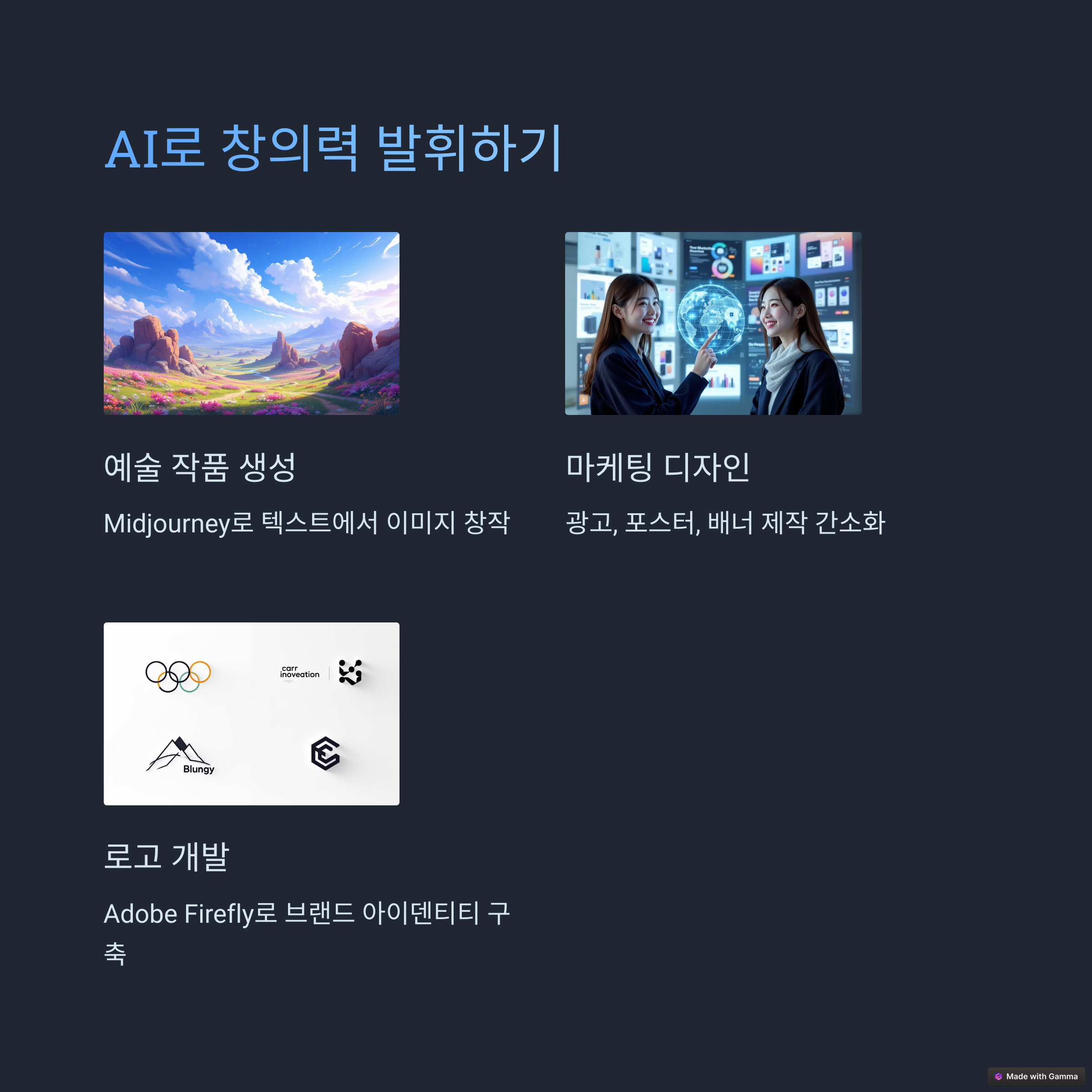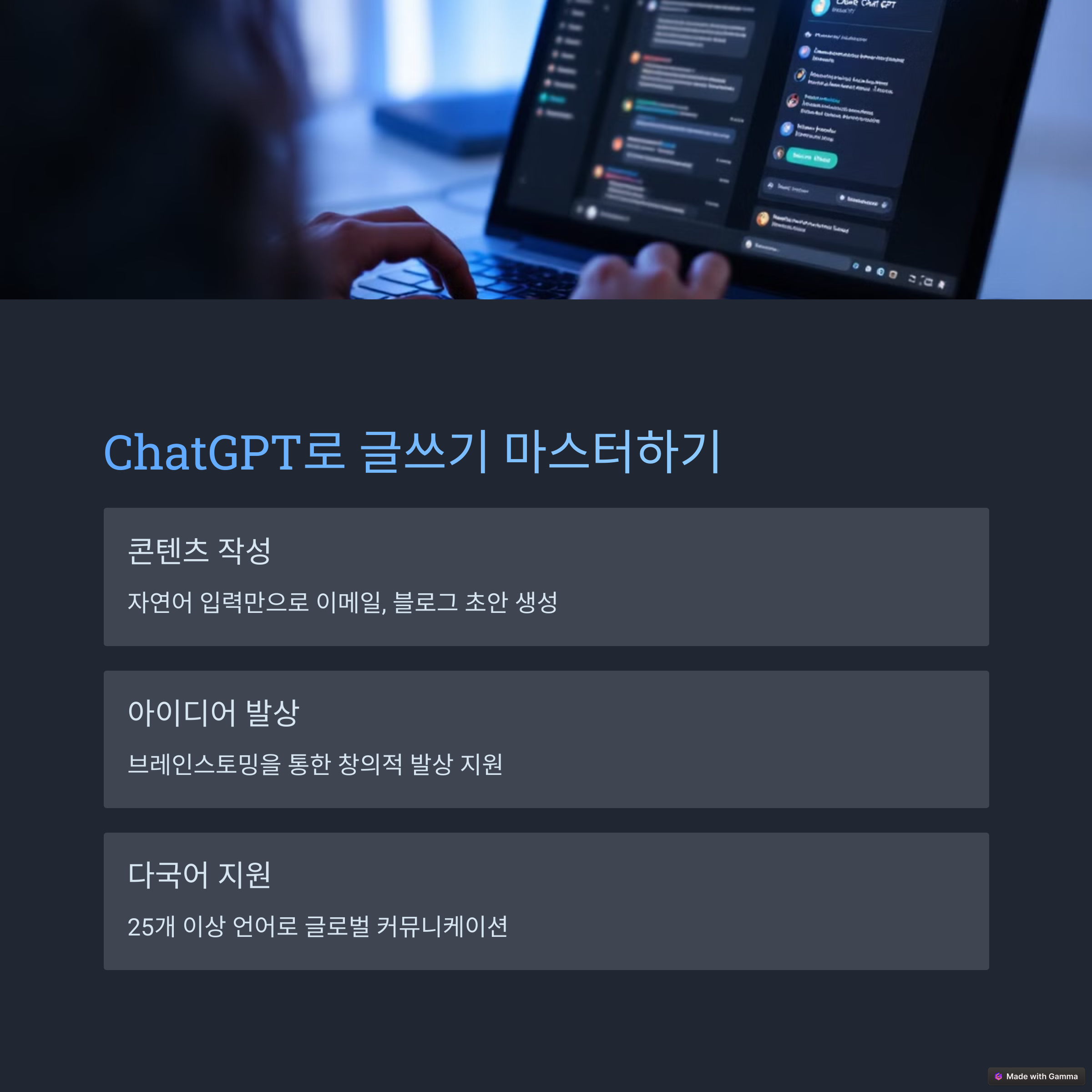 블로그 아이디어 생성, 이메일 자동 작성, 유튜브 스크립트 작성, 번역, 이미지 제작 등 다양한 영역에서 AI를 일상적으로 활용할 수 있습니다.