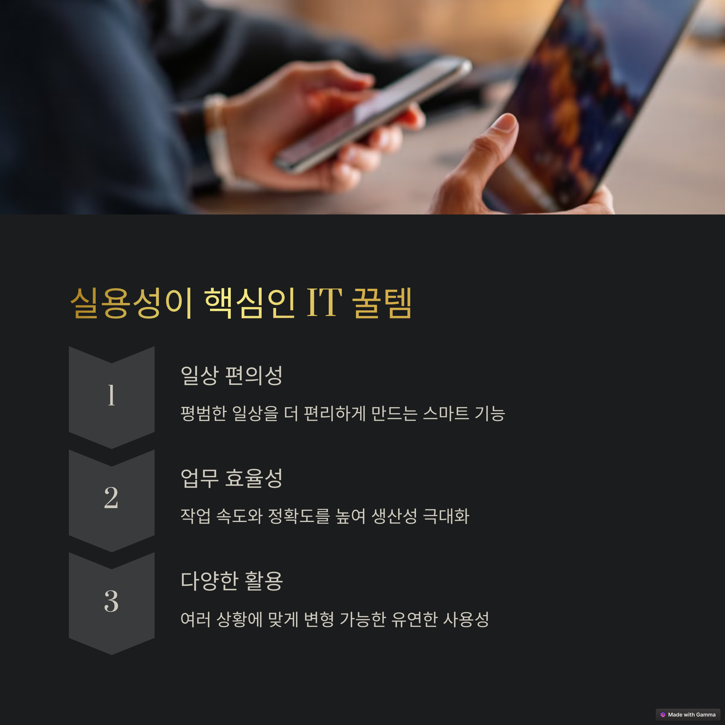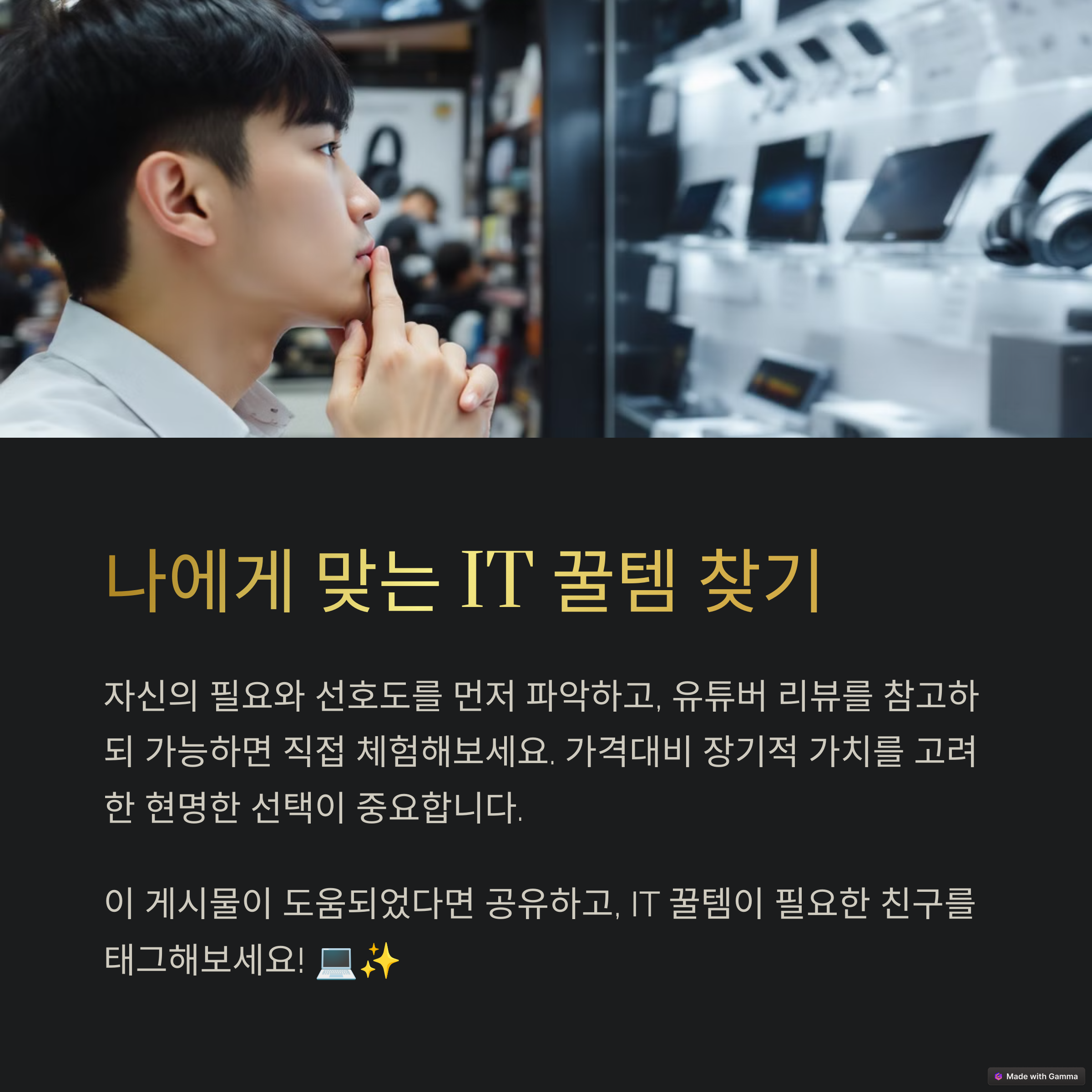 테크 유튜버들의 추천은 단순 광고 이상의 가치를 지닙니다. 다양한 기기 중 실제 사용에서 만족도가 높은 제품들을 소개하며, 소비자 입장에서 실질적인 도움을 주고 있죠. 오늘 소개한 IT 꿀템들은 단순히 멋진 제품이 아닌 일상 속에서 유용함을 증명한 아이템들입니다. 현명한 소비는 정보에서 시작되며, 여러분의 삶에 작지만 의미 있는 변화를 줄 수 있는 IT 아이템을 선택해보세요.