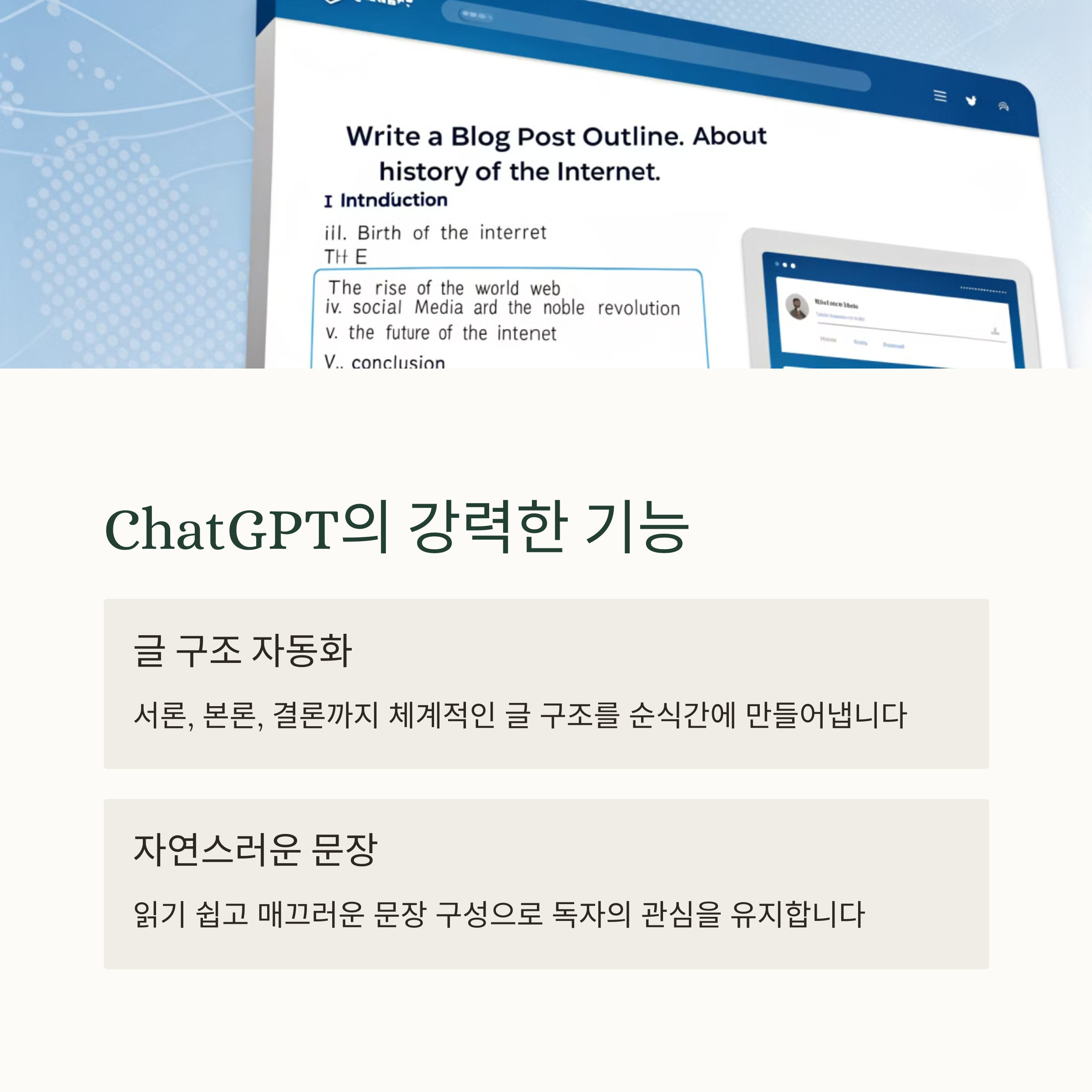 인공지능을 활용한 글쓰기는 기존의 블로그 운영 방식에 혁신을 가져다주고 있습니다. 가장 큰 장점은 글을 쓰는 시간 자체를 획기적으로 줄일 수 있다는 점입니다. 블로거들은 자주 겪는 고민인 '오늘 뭐 쓰지?'라는 문제에서 AI의 도움을 받아 다양한 주제 아이디어를 도출하고, 문장의 초안을 빠르게 생성할 수 있습니다. 특히 ChatGPT와 같은 도구는 키워드를 입력하기만 하면 자동으로 글의 구조를 잡고, 논리적이고 유려한 문장을 완성해 줍니다. 이러한 방식은 글쓰기에 부담을 느끼는 분들에게 새로운 가능성과 동기를 부여합니다.
