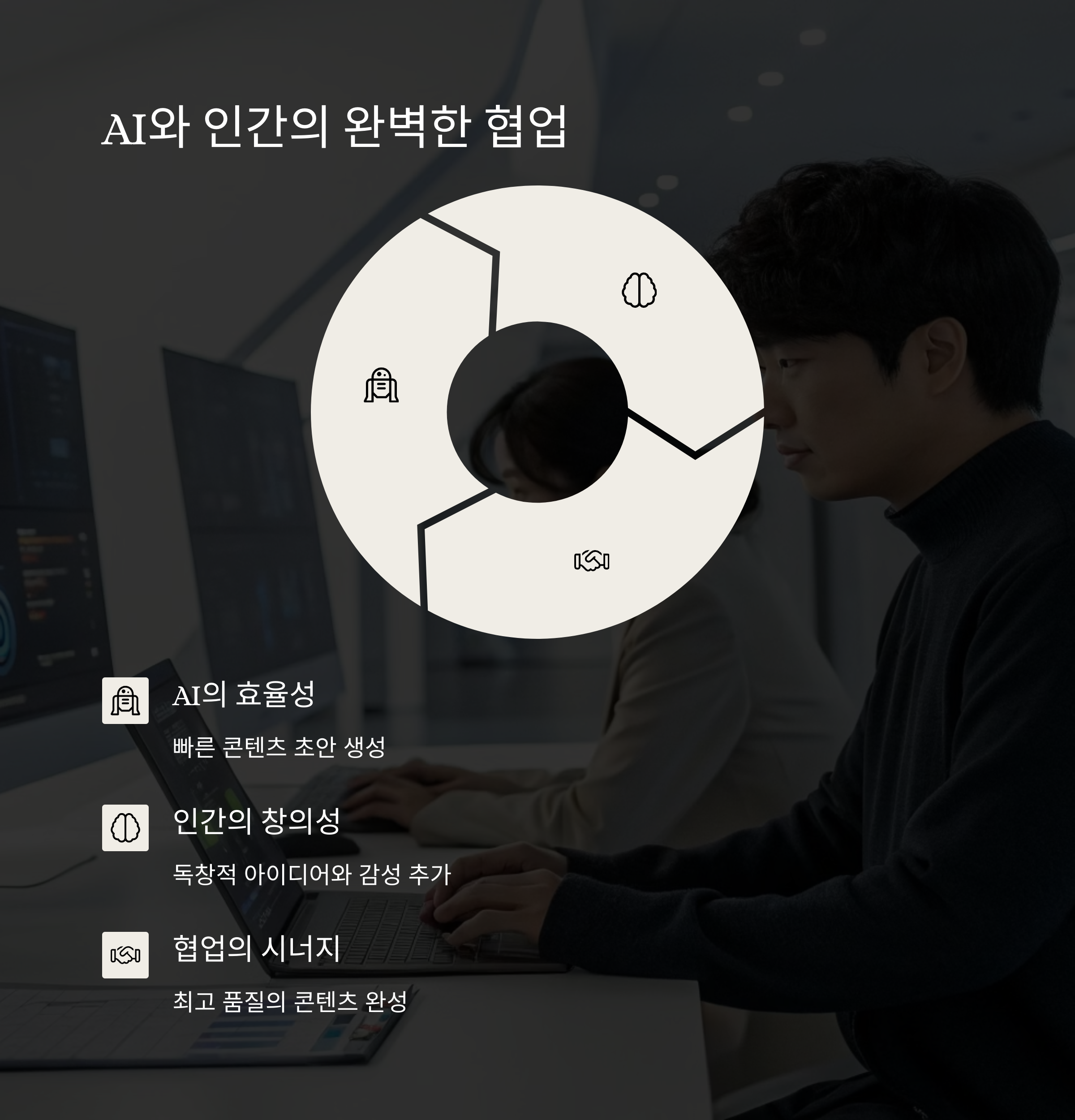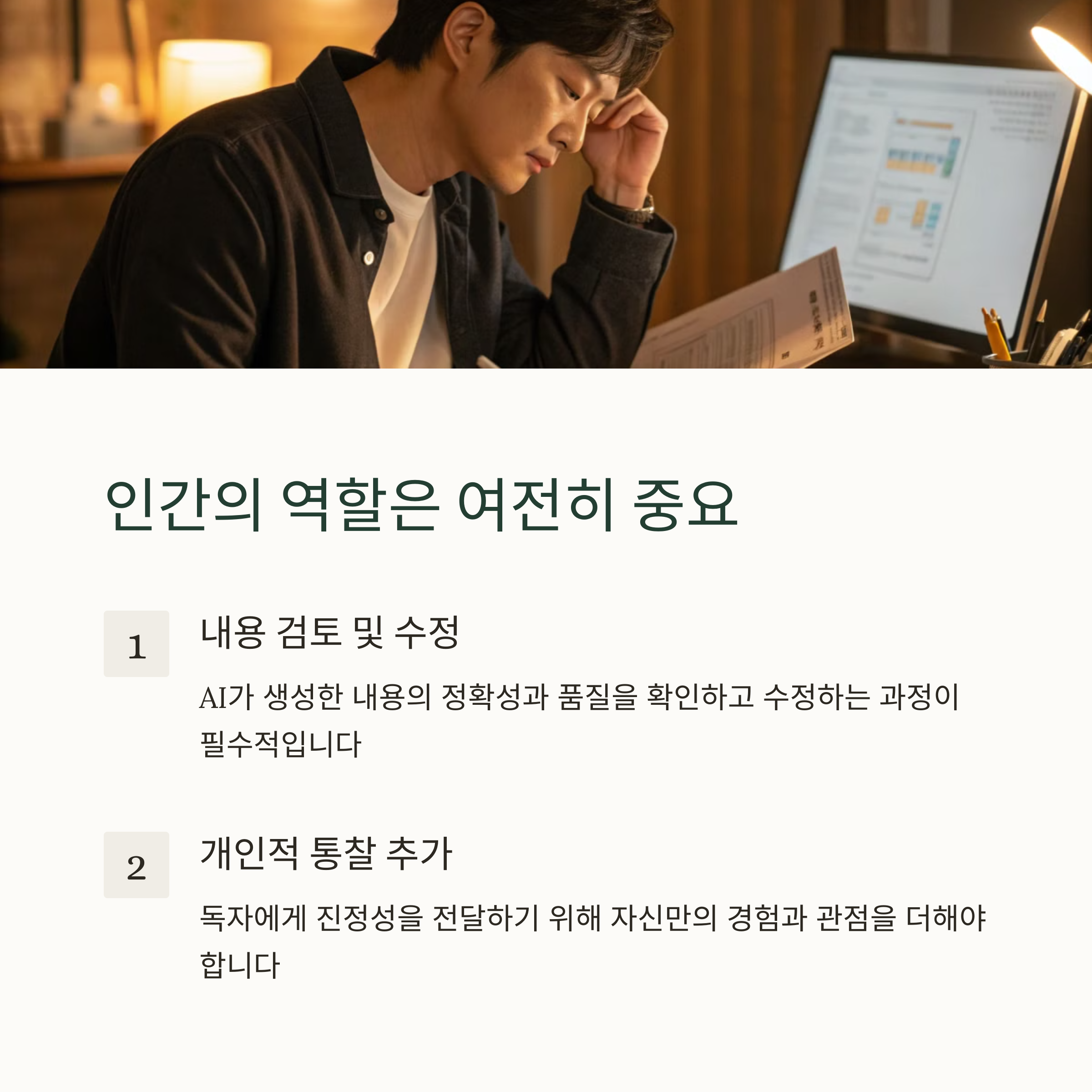 물론 AI 글쓰기가 완벽한 것은 아닙니다. 생성된 글을 그대로 올리는 것보다는 사람의 손길로 다듬고, 맥락을 조정하는 작업이 반드시 필요합니다. 그래야 블로그 방문자에게 신뢰를 줄 수 있습니다. 인공지능은 강력한 보조 도구이지, 모든 걸 대신해주는 마법의 도구는 아닙니다. 결국 AI와 사람이 협업해 콘텐츠를 만들어 나가는 것이 지속 가능한 블로그 운영의 핵심이라 할 수 있습니다. 효율과 품질을 모두 챙길 수 있는 AI 글쓰기, 지금부터 실천해보는 건 어떨까요?