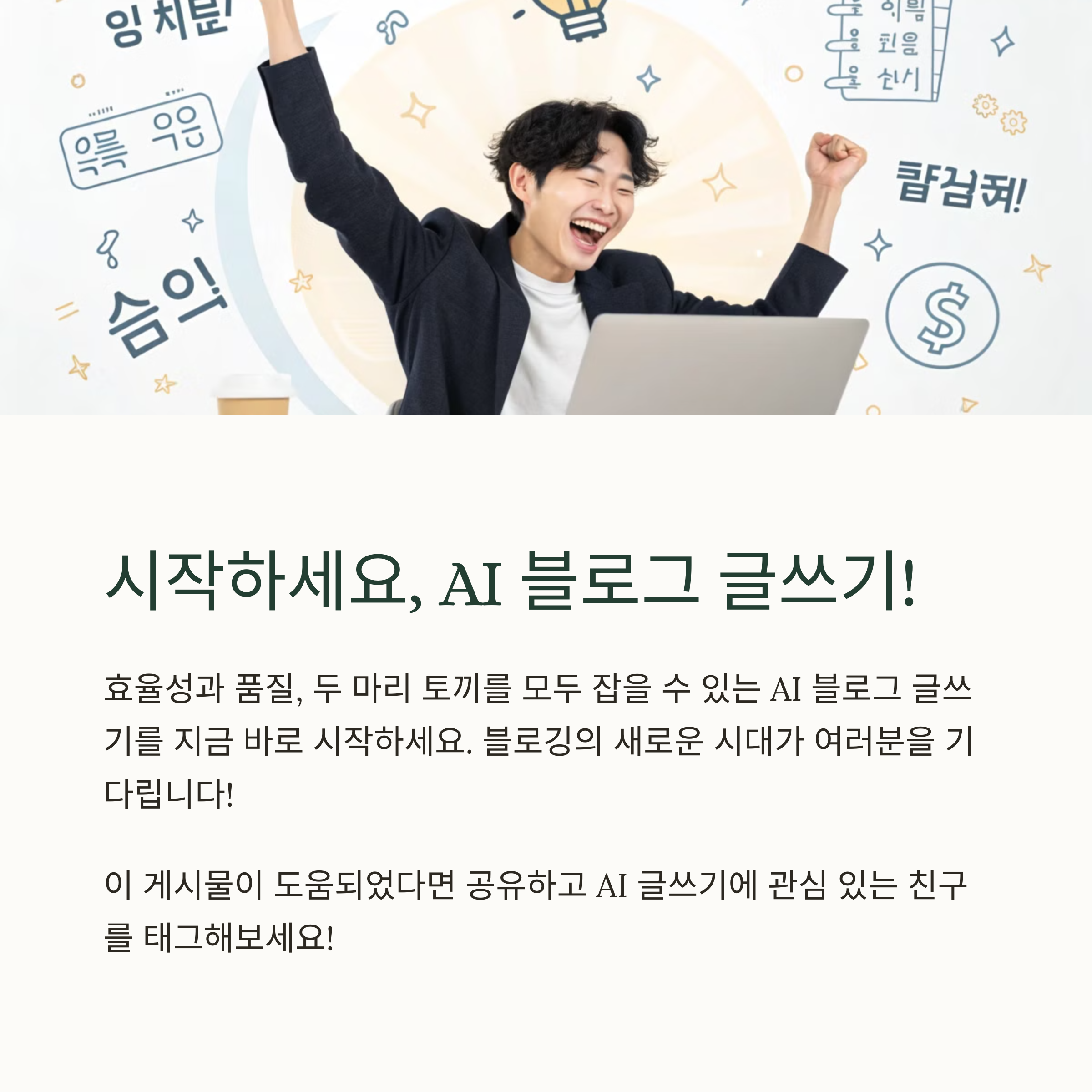 인공지능을 활용한 블로그 글쓰기는 더 이상 선택이 아닌 필수 도구로 자리 잡고 있습니다. 주제 선정, 문장 구성, SEO 설계까지 AI의 도움을 받으면 더욱 빠르고 효율적으로 블로그 운영이 가능합니다. 그러나 그만큼 사람만의 감성, 스토리텔링, 경험이 더 중요한 시대가 되었습니다. AI는 글을 써주는 도구가 아니라, 글을 함께 만들어가는 파트너라는 점을 기억해야 합니다. 오늘부터 여러분도 AI와 함께 한층 더 완성도 높은 블로그를 운영해보세요.
