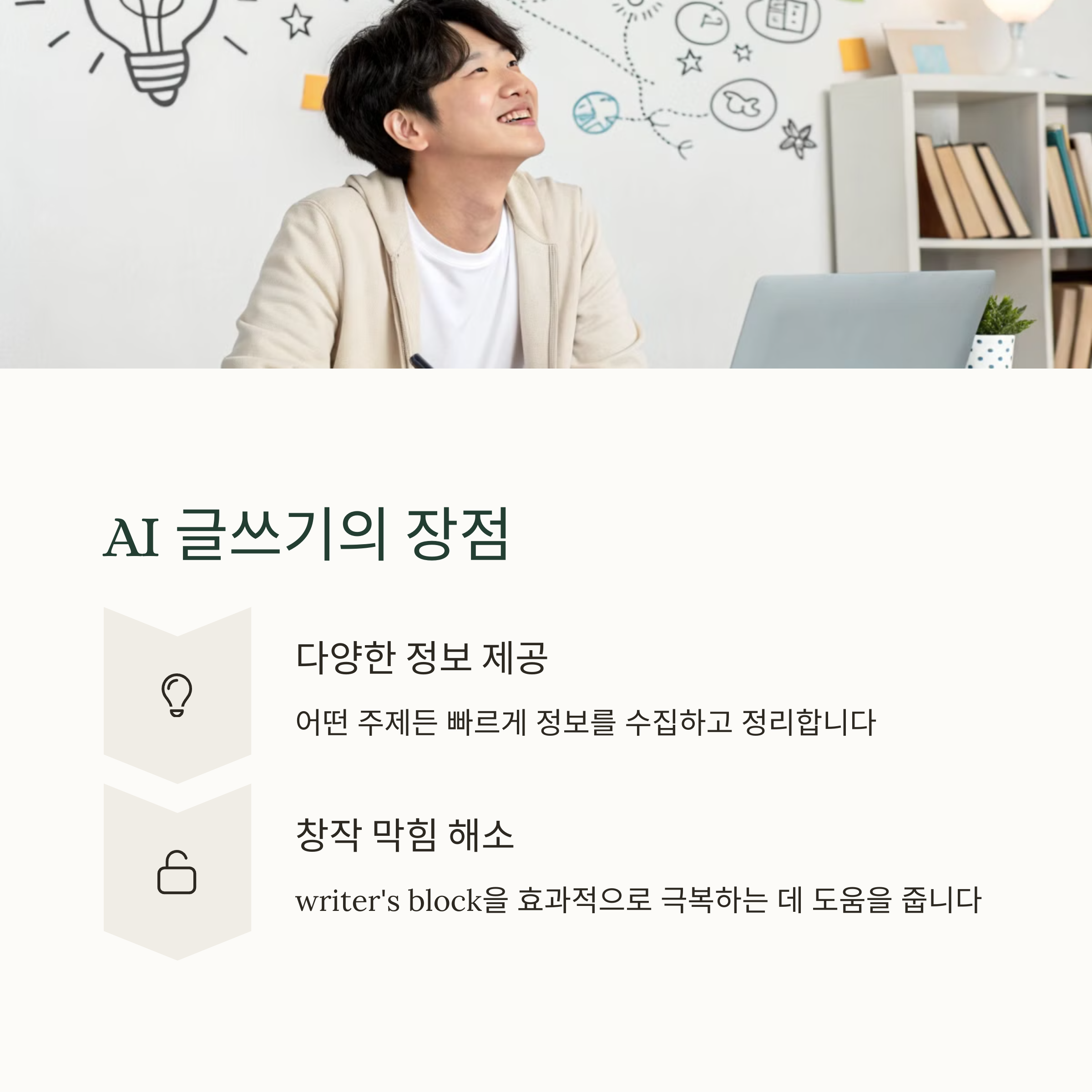 AI 글쓰기 장점 | 시간 절약, 문장 품질 향상, SEO 구조 자동화 가능 |